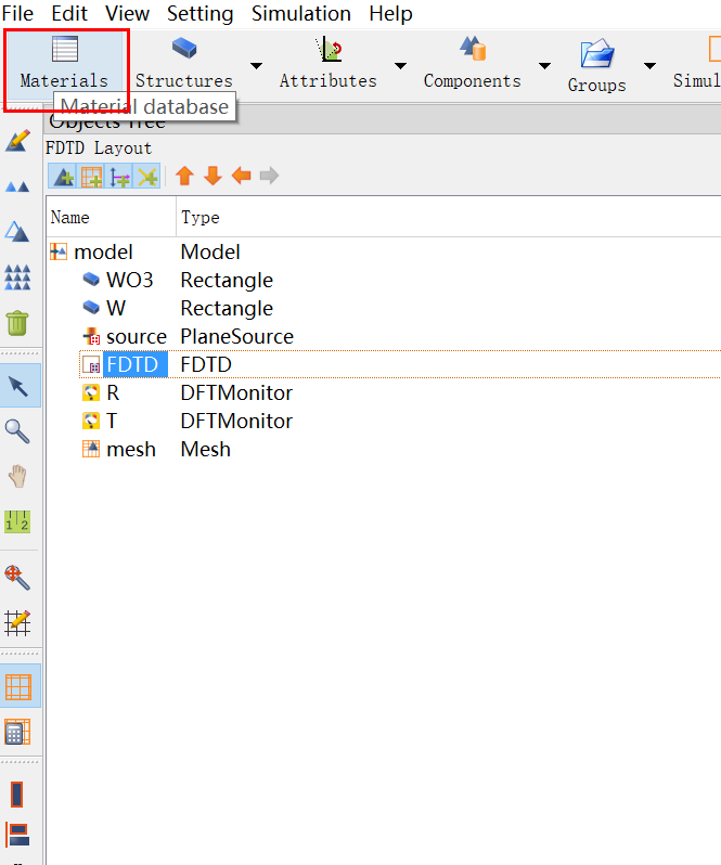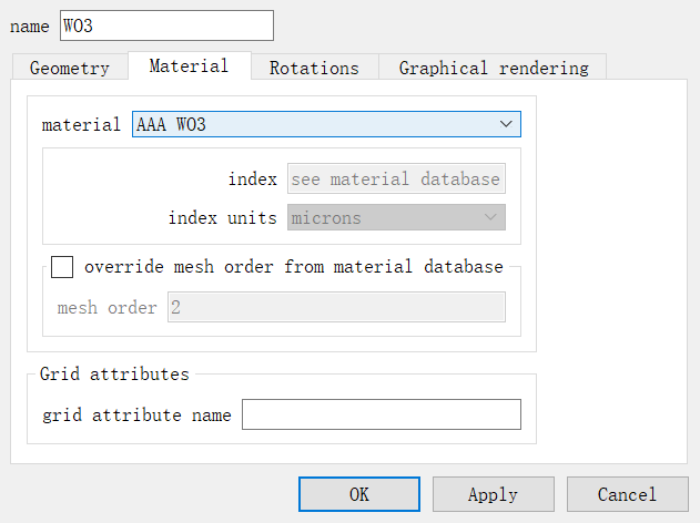 结构添加可以直接查看WO3.fsp文件中的设置,这里只需要设置几何位置和材料属性,记得WO3材料选用刚才添加的。