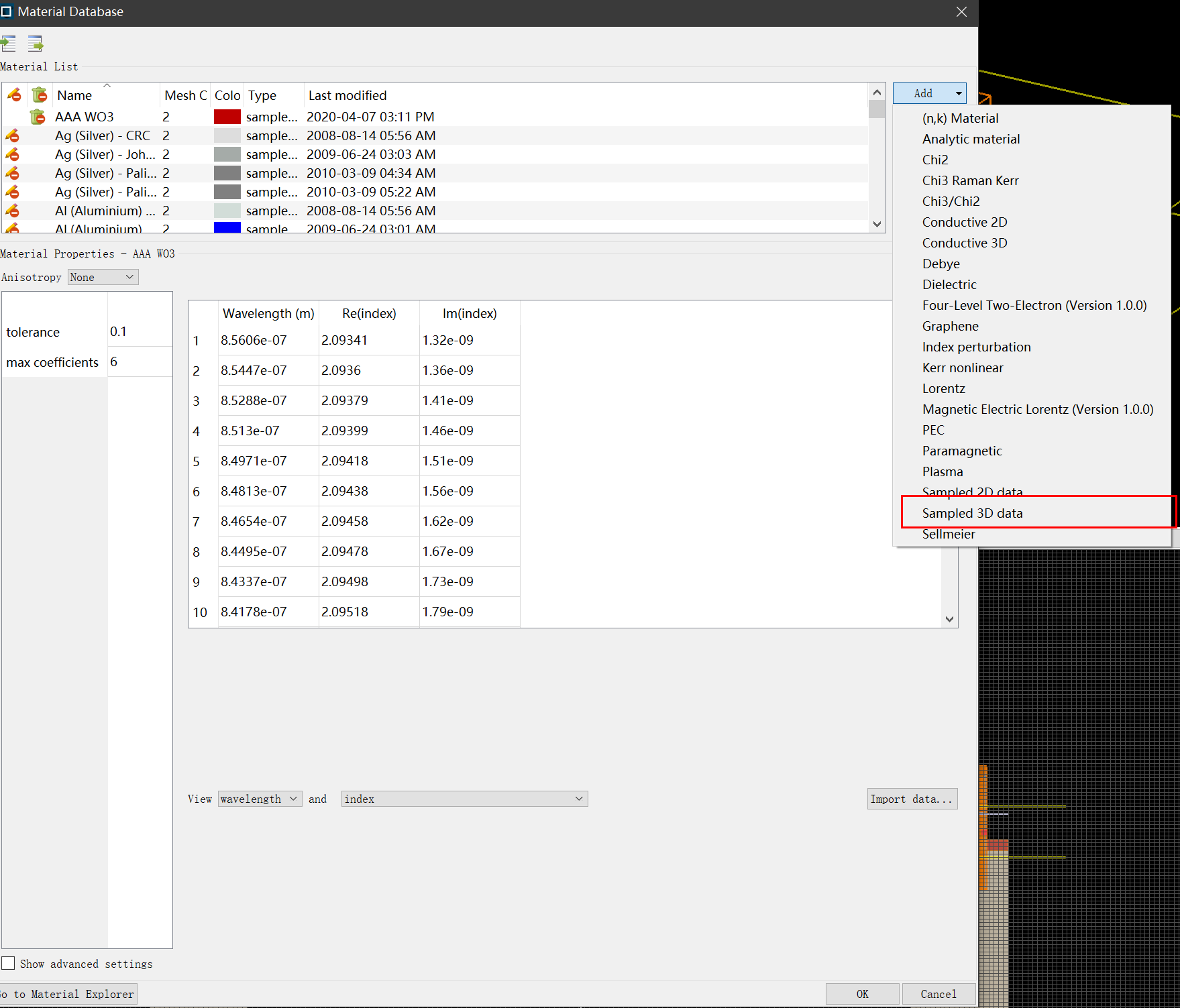 点击Import,在Select File中选择折射率文件,导入即可。