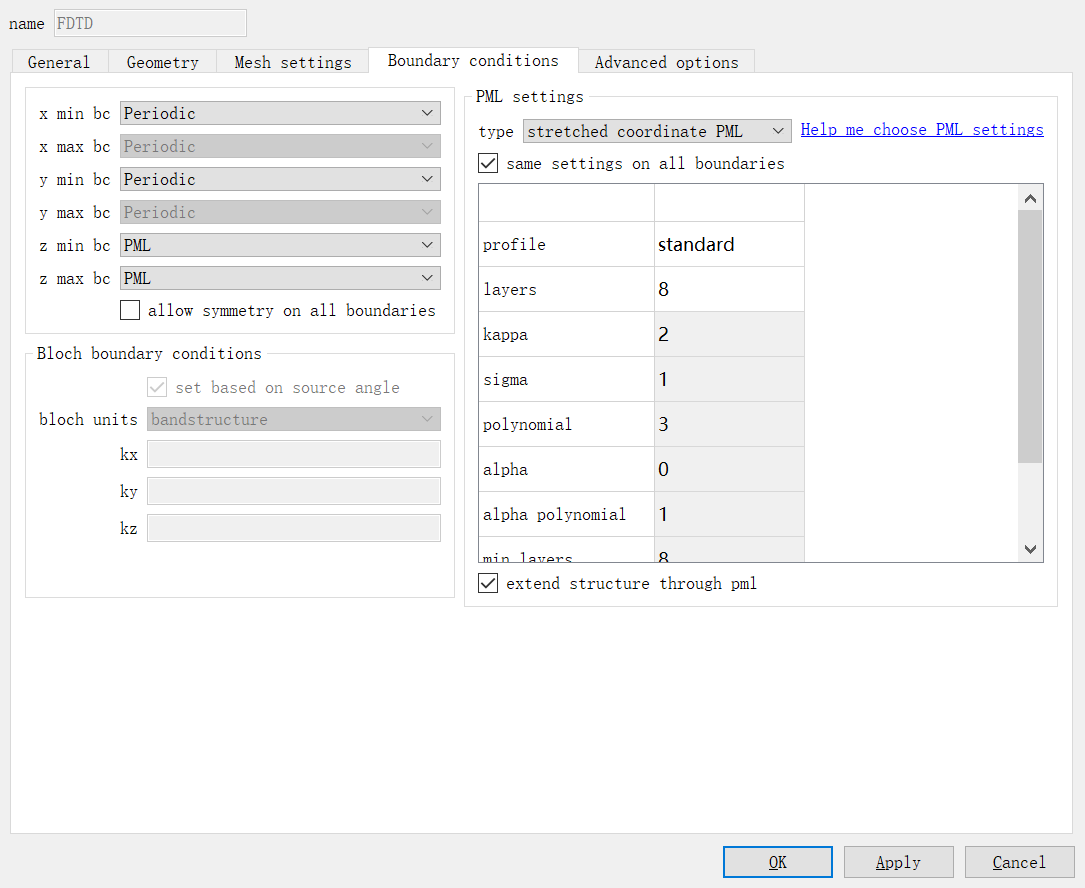 由于你这个是薄膜结构,X和Y方向是无限延伸的,z方向是你的结构,因此X,Y方向设置成周期性边界条件,边界条件中PML层profile可以默认standard,也可以设置成steep