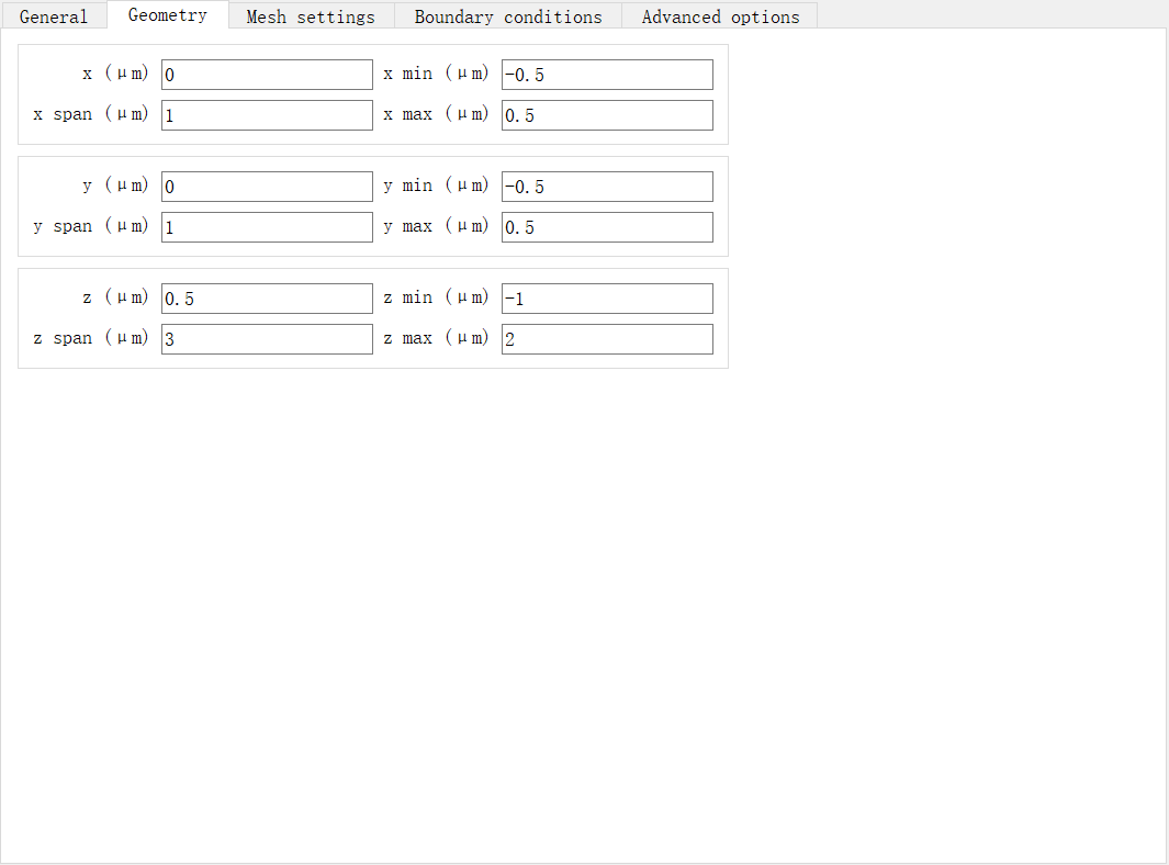 结构尺寸上按需求设置,X,Y方向没有特别要求,Z方向最小值应设置在W层中,最大值在WO3上方,同时远离结构至少半个波长。其他不需要特别修改,默认即可。