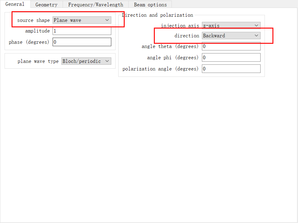 光源选择平面波,入射方向设置z负方向。光源尺寸大于FDTD尺寸(如果没有大于会在仿真时自动拓展),光源放置在结构上方,具体可以对比结构尺寸和光源尺寸查看。