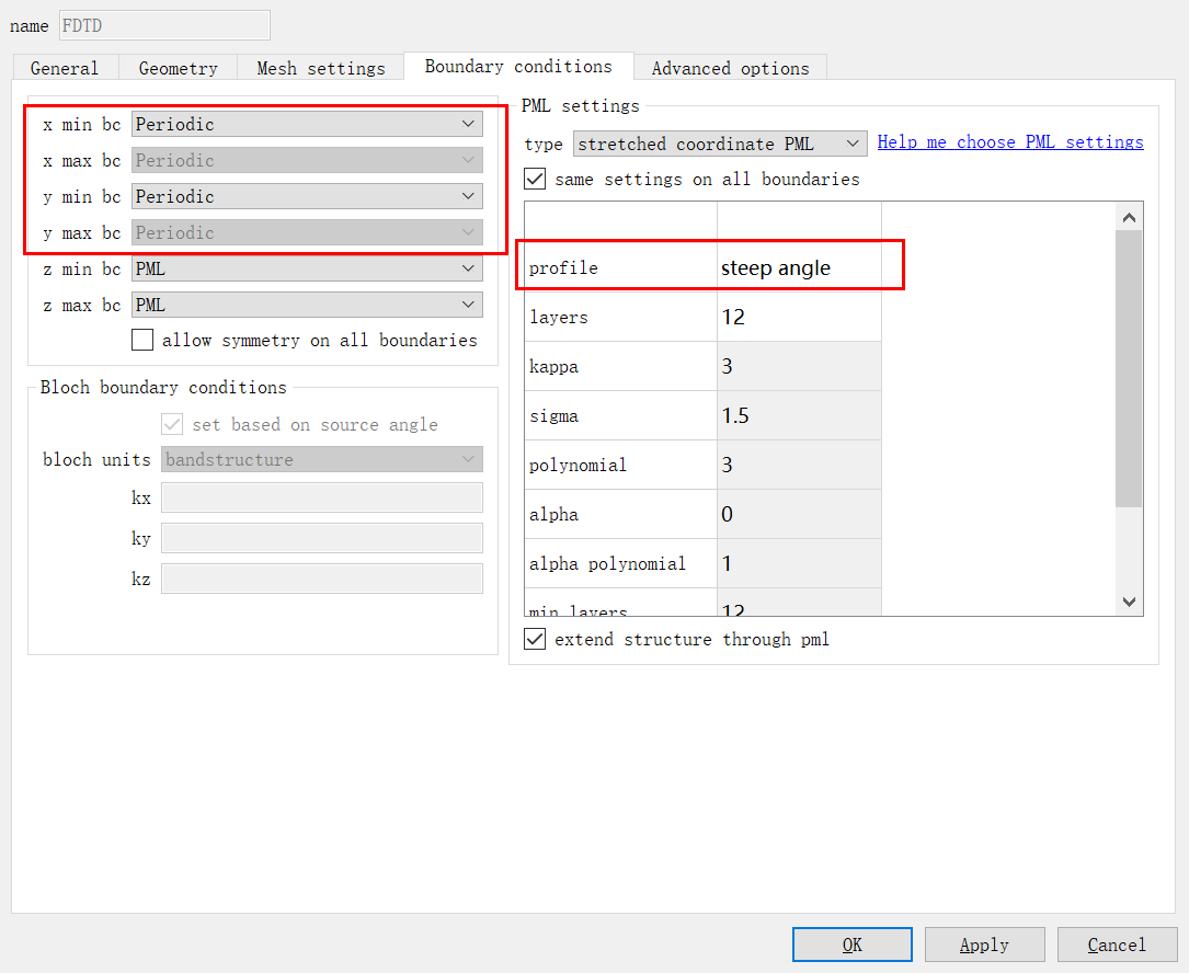 点击Simulation,添加FDTD。由于是薄膜结构,X和Y方向是无限延伸的,因此X,Y方向设置成周期性边界条件,周期性边界条件的情况下PML可以设置成steep