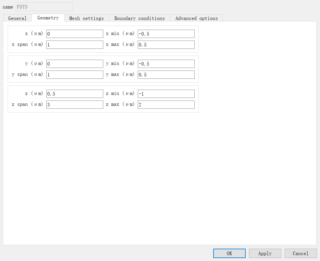 结构尺寸上按需求设置,X,Y方向没有特别要求,Z方向最小值应设置在W层中,最大值在WO3上方,同时远离结构至少半个波长。其他不需要特别修改,默认即可。