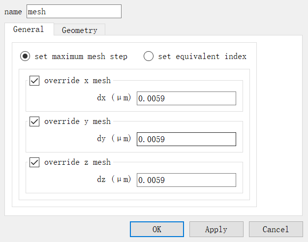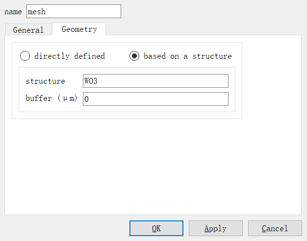 点击Simulation右方的下拉菜单,添加Mesh。建模设计过程没有明显的先后次序要求,Mesh什么时候设置都可以。网格有两种添加方案,一是设置Mesh的尺寸,二是基于结构,这里主要考虑WO3/W薄膜反射率,可以把mesh加到WO3上。