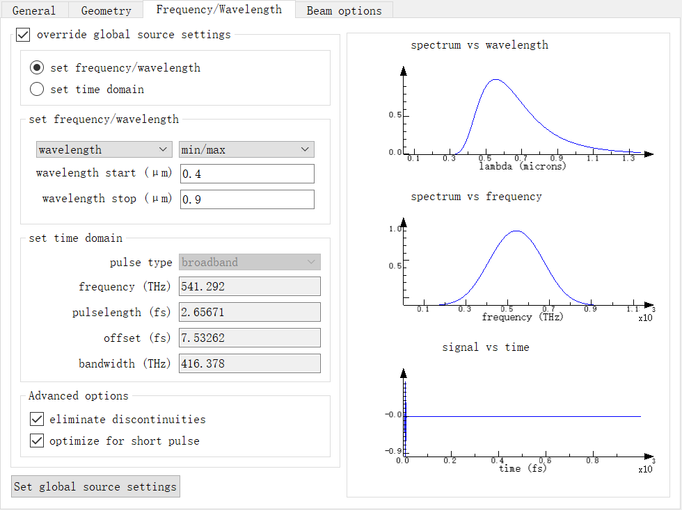 点击Sources,加入光源。光源选择平面波,入射方向设置z负方向。光源尺寸大于FDTD尺寸(如果没有大于会在仿真时自动拓展),光源放置在结构上方,具体可以对比结构尺寸和光源尺寸查看。