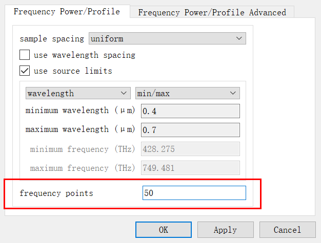 Frequency points数量设置为50,这个数值越大,谱线越光滑。