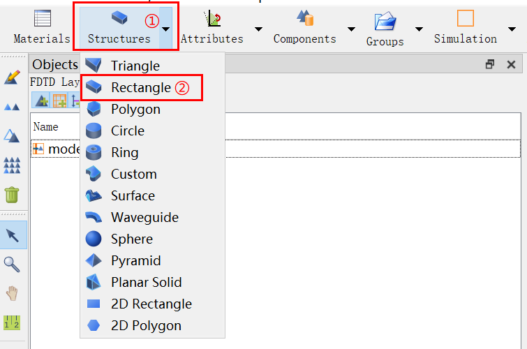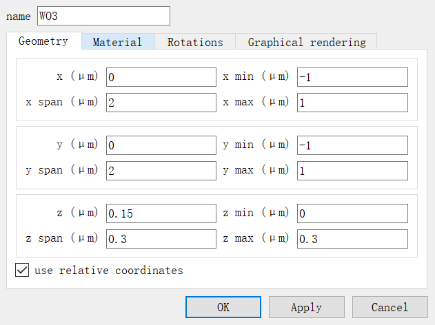 结构添加通过Structures添加,选择Rectangle,添加WO3薄膜,