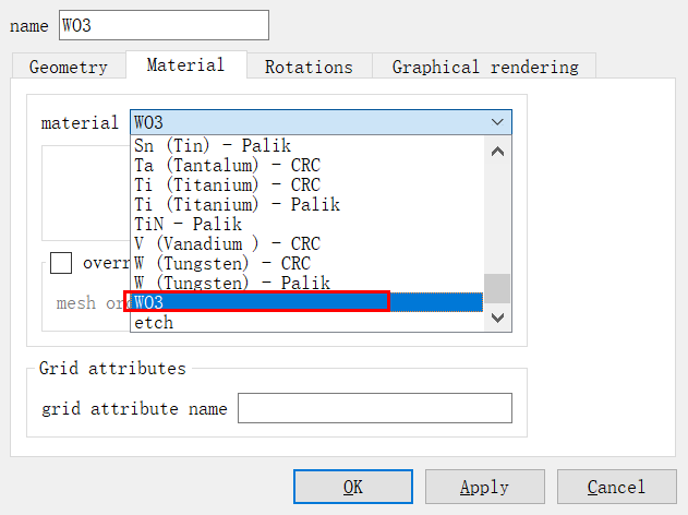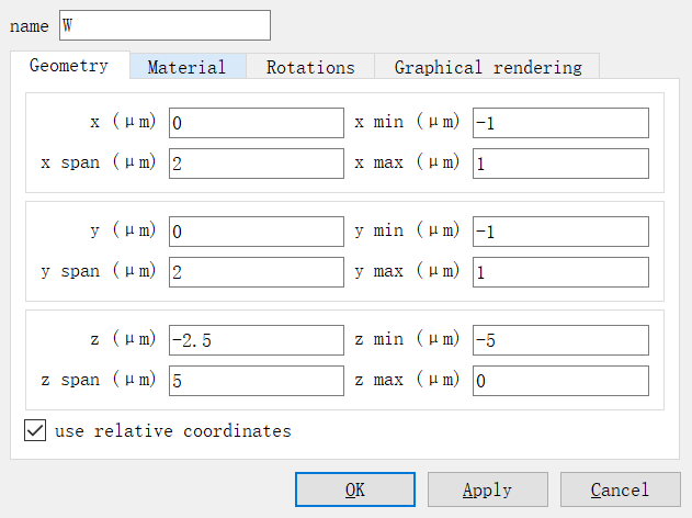 相同的思路,添加W层,WO3是在W上方,因此设置的时候Z方向的数值应契合好。相关设置如下: