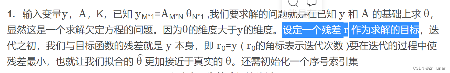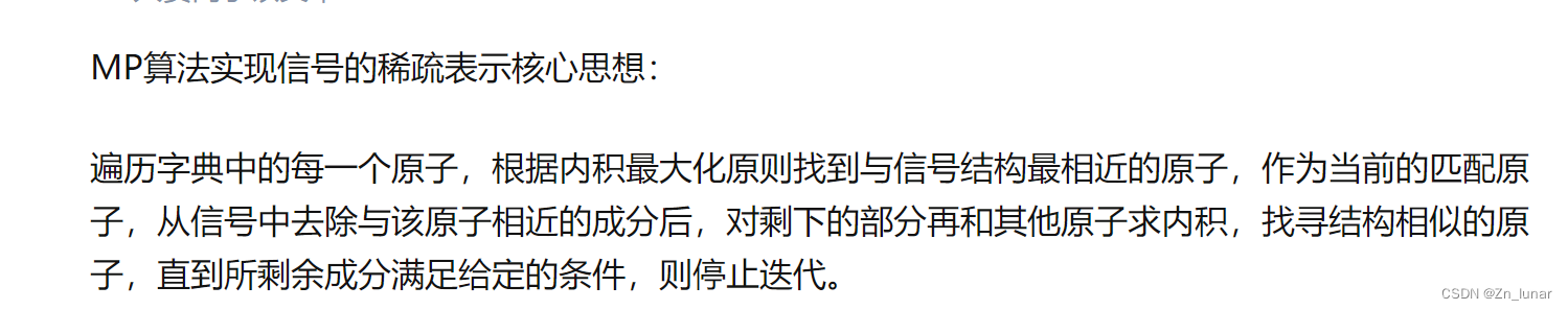 https://zhuanlan.zhihu.com/p/62141208#:~:text=%E5%8C%B9%E9%85%8D%E8%BF%BD%E8%B8%AA%E7%AE%97%E6%B3%95%EF%BC%88match%20pursuit%2C%20MP%EF%BC%89%E5%AE%9E%E7%8E%B0%E4%BF%A1%E5%8F%B7%E7%9A%84%E7%A8%80%E7%96%8F%E8%A1%A8%E7%A4%BA.%20%E9%81%8D%E5%8E%86%E5%AD%97%E5%85%B8%E4%B8%AD%E7%9A%84%E6%AF%8F%E4%B8%80%E4%B8%AA%E5%8E%9F%E5%AD%90%EF%BC%8C%E6%A0%B9%E6%8D%AE%E5%86%85%E7%A7%AF%E6%9C%80%E5%A4%A7%E5%8C%96%E5%8E%9F%E5%88%99%E6%89%BE%E5%88%B0%E4%B8%8E%E4%BF%A1%E5%8F%B7%E7%BB%93%E6%9E%84%E6%9C%80%E7%9B%B8%E8%BF%91%E7%9A%84%E5%8E%9F%E5%AD%90%EF%BC%8C%E4%BD%9C%E4%B8%BA%E5%BD%93%E5%89%8D%E7%9A%84%E5%8C%B9%E9%85%8D%E5%8E%9F%E5%AD%90%EF%BC%8C%E4%BB%8E%E4%BF%A1%E5%8F%B7%E4%B8%AD%E5%8E%BB%E9%99%A4%E4%B8%8E%E8%AF%A5%E5%8E%9F%E5%AD%90%E7%9B%B8%E8%BF%91%E7%9A%84%E6%88%90%E5%88%86%E5%90%8E%EF%BC%8C%E5%AF%B9%E5%89%A9%E4%B8%8B%E7%9A%84%E9%83%A8%E5%88%86%E5%86%8D%E5%92%8C%E5%85%B6%E4%BB%96%E5%8E%9F%E5%AD%90%E6%B1%82%E5%86%85%E7%A7%AF%EF%BC%8C%E6%89%BE%E5%AF%BB%E7%BB%93%E6%9E%84%E7%9B%B8%E4%BC%BC%E7%9A%84%E5%8E%9F%E5%AD%90%EF%BC%8C%E7%9B%B4%E5%88%B0%E6%89%80%E5%89%A9%E4%BD%99%E6%88%90%E5%88%86%E6%BB%A1%E8%B6%B3%E7%BB%99%E5%AE%9A%E7%9A%84%E6%9D%A1%E4%BB%B6%EF%BC%8C%E5%88%99%E5%81%9C%E6%AD%A2%E8%BF%AD%E4%BB%A3%E3%80%82.%20%E4%B8%8A%E9%9D%A2%E8%BF%9E%E6%8E%A5%E4%B8%AD%E7%9A%84%E6%96%87%E7%AB%A0%E5%B7%B2%E7%BB%8F%E5%86%99%E7%9A%84%E5%BE%88%E8%AF%A6%E7%BB%86%E6%98%93%E4%BA%8E%E7%90%86%E8%A7%A3%E4%BA%86%E3%80%82.%20%E4%B8%8B%E9%9D%A2%E6%98%AF%E7%9C%8B%E5%AE%8C%E4%B8%8A%E9%9D%A2%E6%96%87%E7%AB%A0%E7%9A%84%E4%B8%80%E4%BA%9B%E8%87%AA%E5%B7%B1%E7%9A%84%E7%90%86%E8%A7%A3.%20%E5%81%87%E5%A6%82%E7%BB%99%E5%AE%9A%E4%BF%A1%E5%8F%B7%20y%3D,%281.65%2C-0.25%29%20%E5%92%8C%20%E8%B6%85%E5%AE%8C%E5%A4%87%E5%AD%97%E5%85%B8A%3D%20%28d1%2Cd2%2Cd3%29%2C%20d1%EF%BC%8Cd2%EF%BC%8Cd3%E5%88%86%E5%88%AB%E4%B8%BA%E8%B6%85%E5%AE%8C%E5%A4%87%E5%AD%97%E5%85%B8%E4%B8%AD%E7%9A%84%E5%8E%9F%E5%AD%90%EF%BC%8C%E4%B8%94d1%3D%20%28-0.707%3B0.707%29%EF%BC%8Cd2%3D%20%280.8%3B0.6%29%EF%BC%8Cd3%3D%20%280%3B-1%29%3B匹配追踪算法(MP)简介
