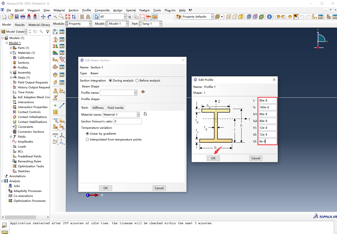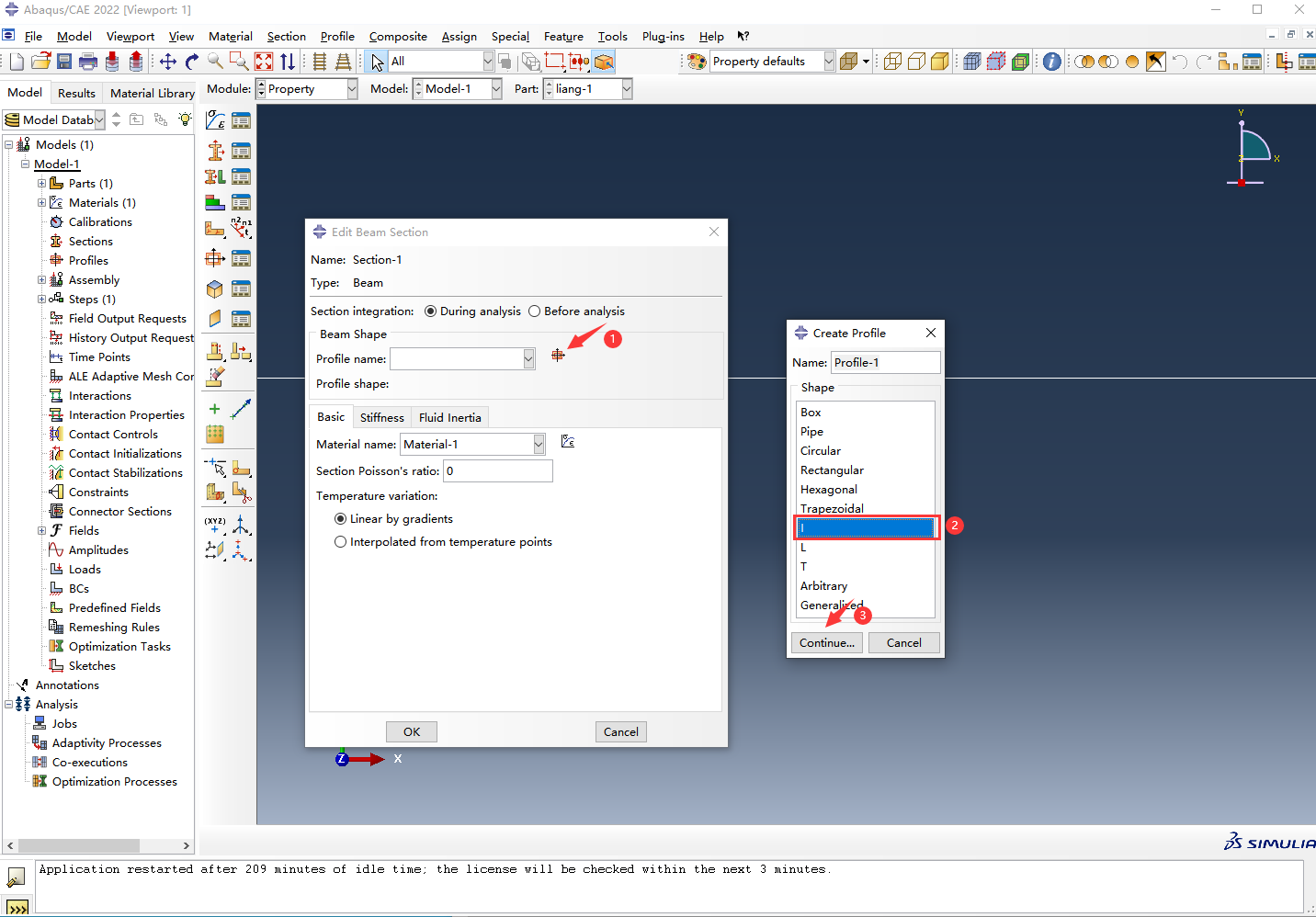 6.创建梁的轮廓,点击创建梁轮廓图标Create Beam profile,选择字母 "I"形,点击继续Continue…。