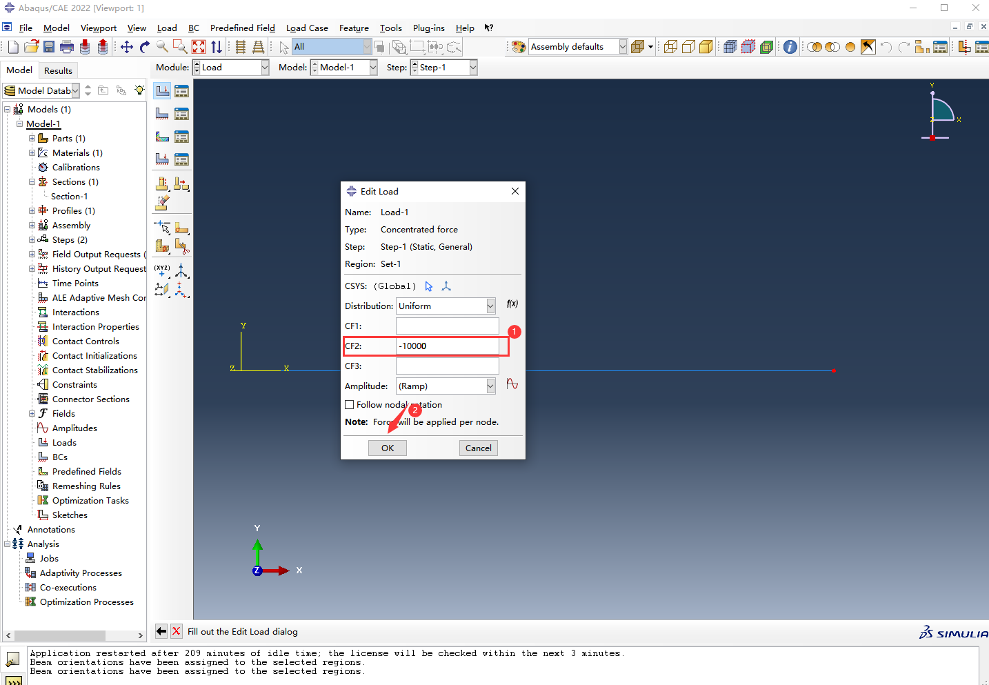 18.把力设置为沿y轴负方向,大小为10000N,点击OK。