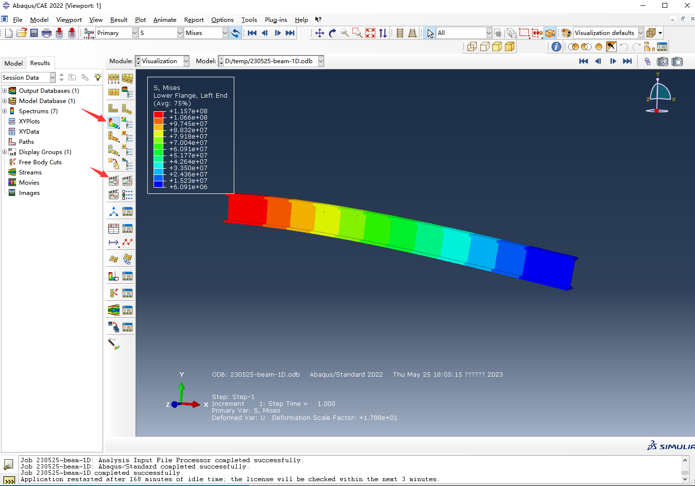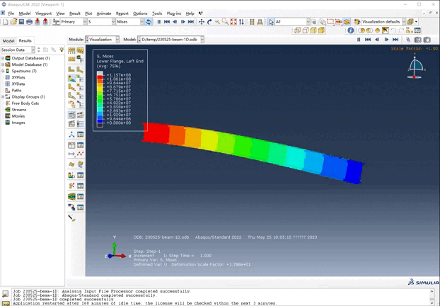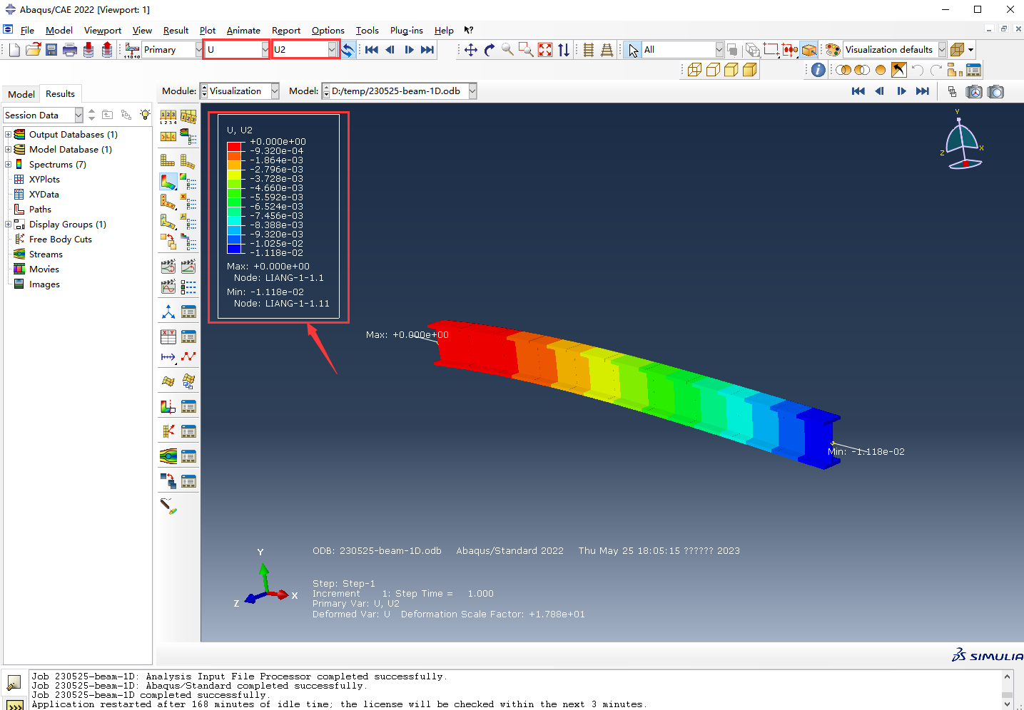 30.通过修改上面的下拉列表参数,可以查看挠度(该实例挠度为Y轴方向,所以选择U2)。最大挠度为11.18mm。