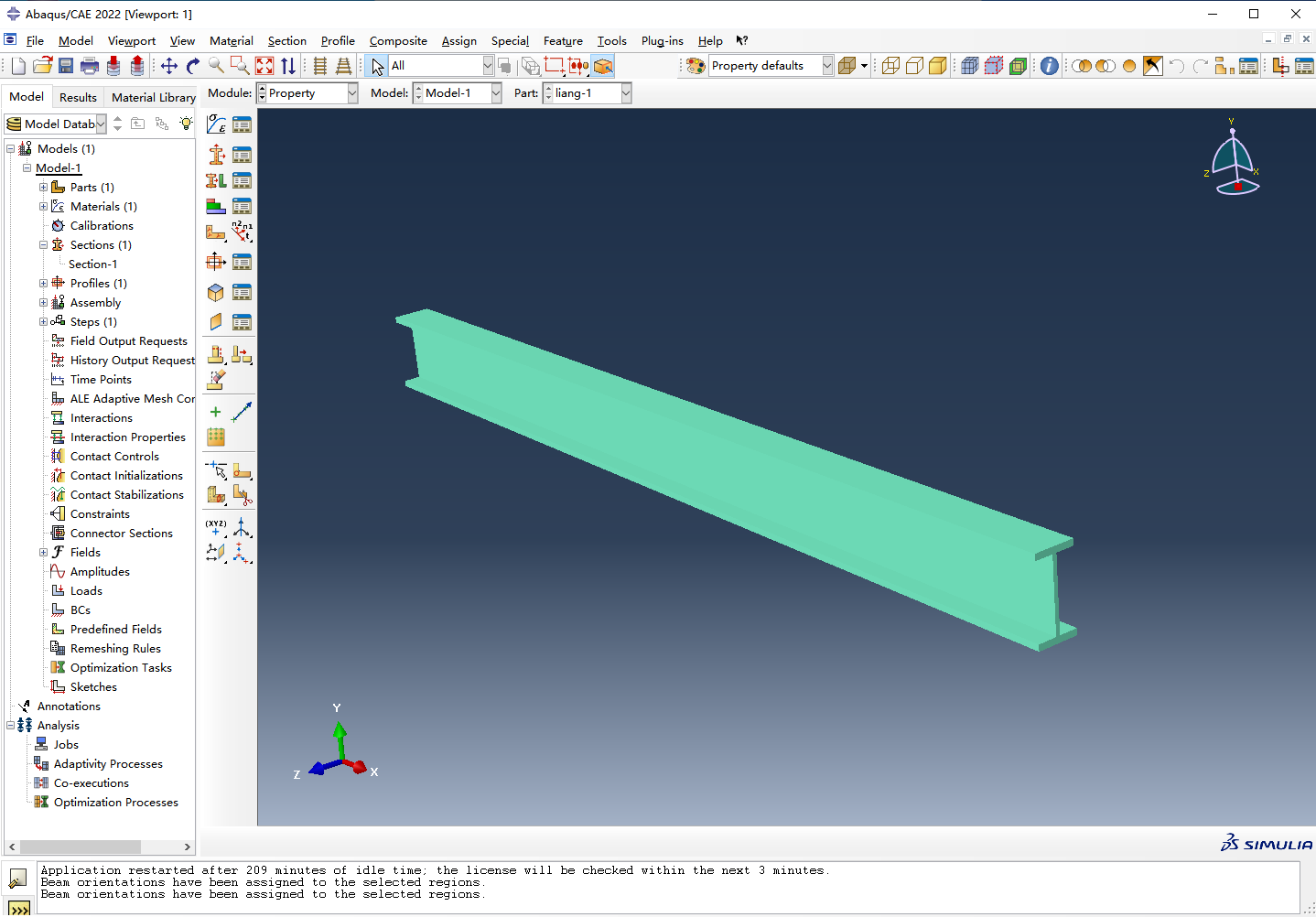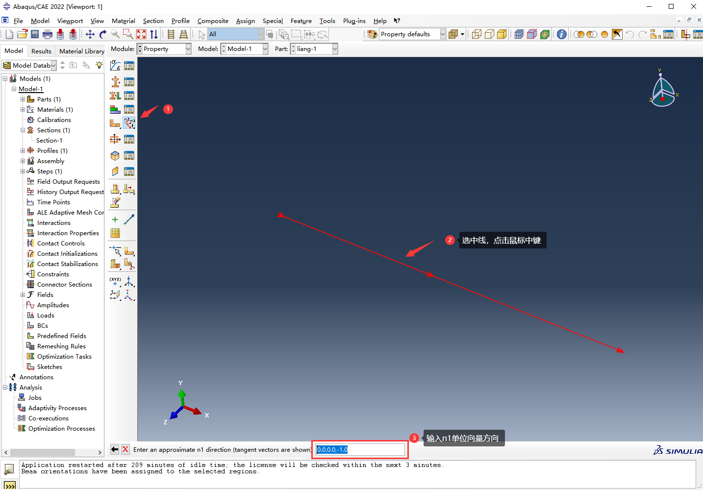 10.为梁赋予方向,点击创建梁方向,选中线条,点击鼠标中键,输入n1向量确定方向,这里直接默认(0,0,-1)即可。