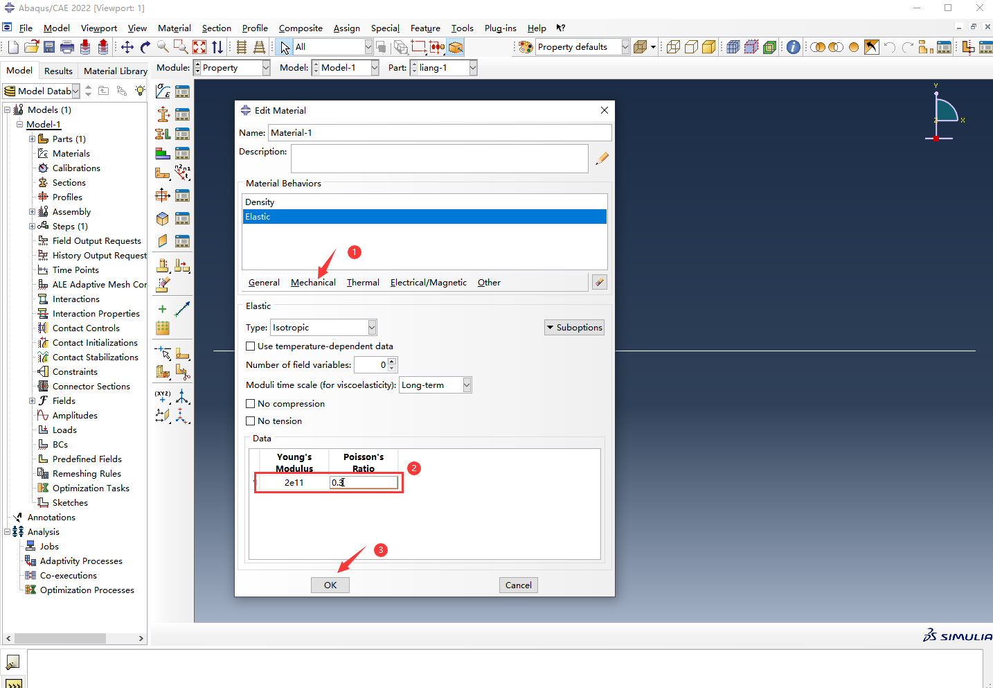 4. 在 Edit Material 窗口,点击Mechanical—>Elasticity—>Elastic,填入弹性模量2e11与泊松比0.3。然后点击OK。