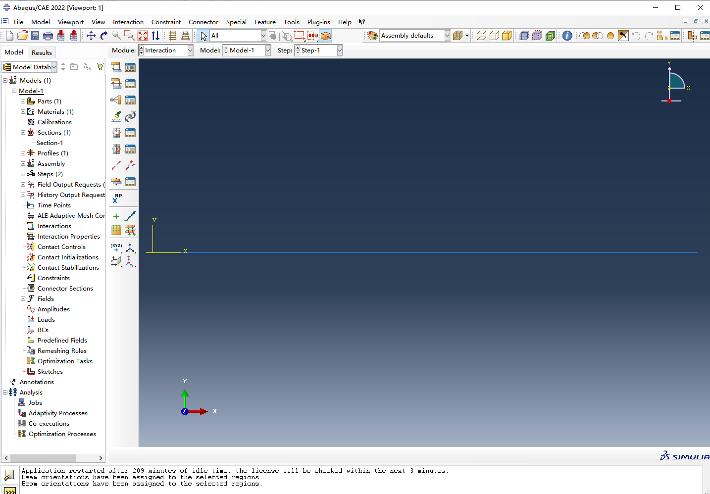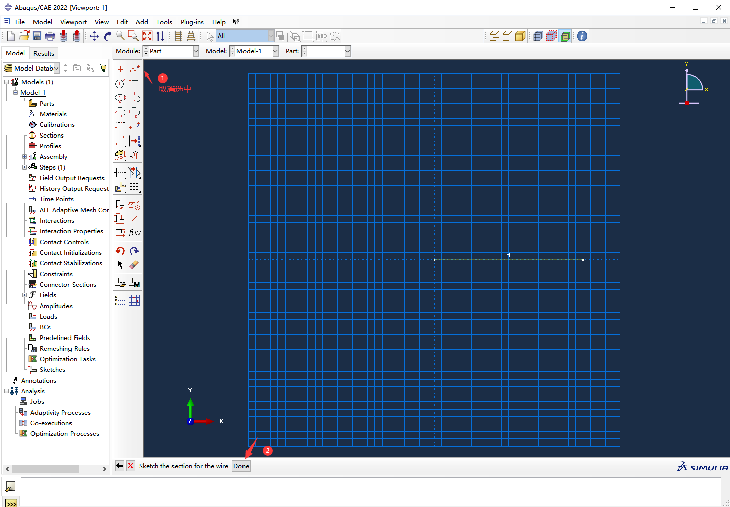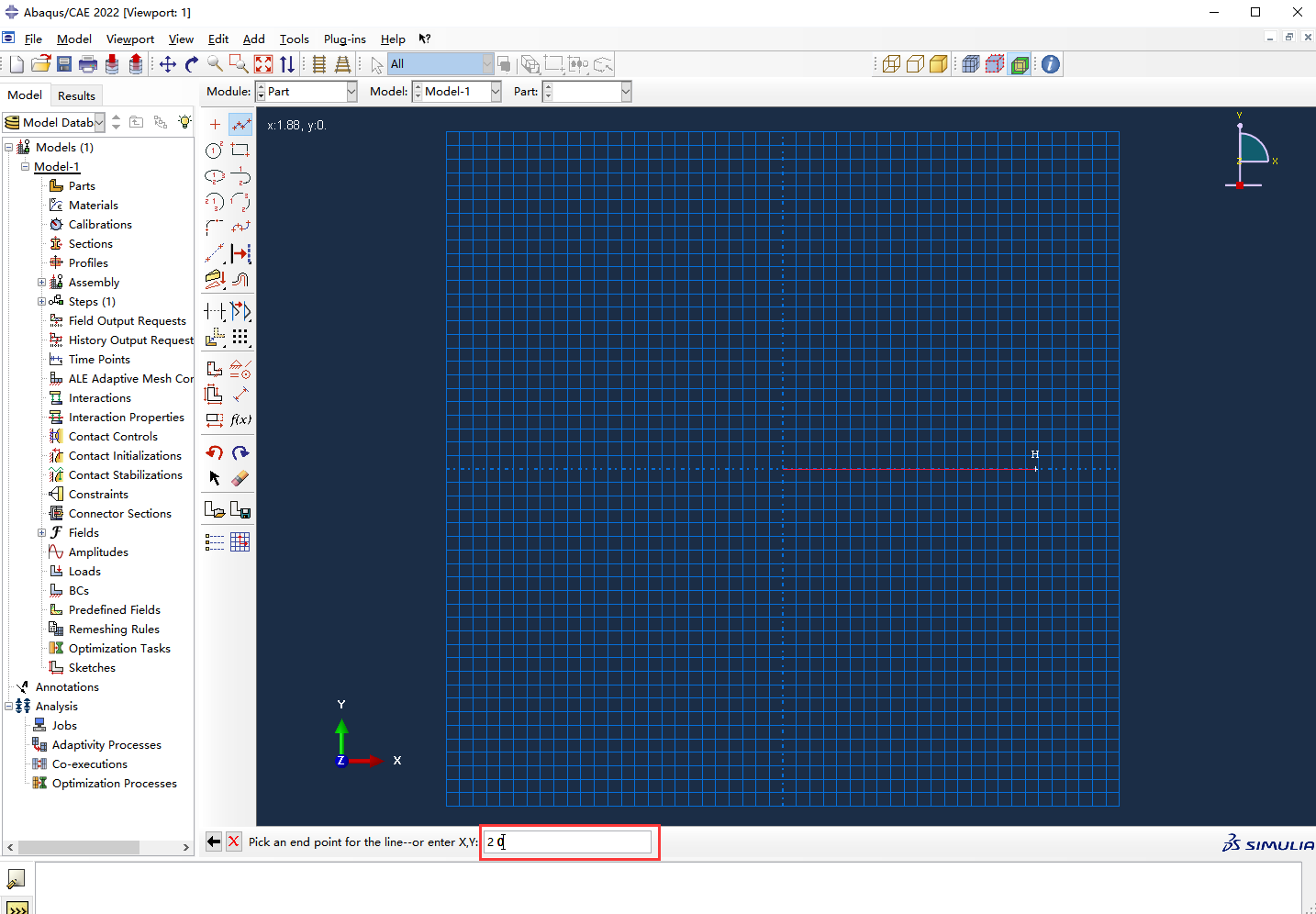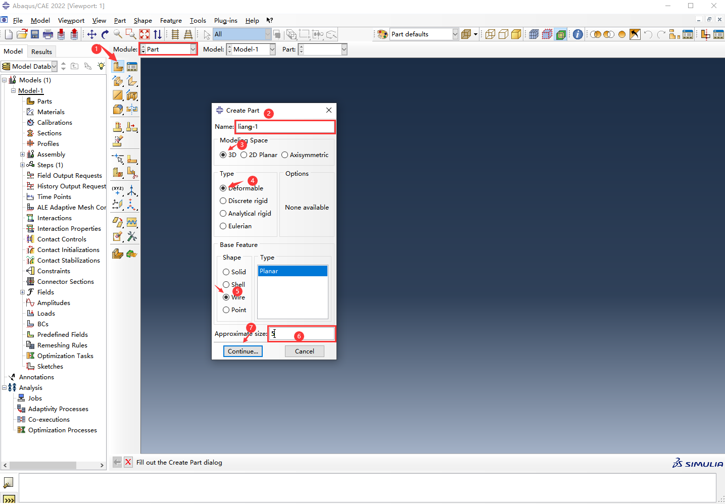 1.打开部件的模块,创建一个零件。Name:自定义命名;Modeling Space:梁的空间选择3D; Type :类型选择变形体Deformable;Base Feature中的Shape:选择线Wire;Approximate size:大致的模型尺寸根据题目设为5 (注:Abaqus没有单位系统,所有涉及单位的需要自定义,本次按照国际单位进行输入,长度基本单位为m,梁的总长度为2m,所以设置的大致尺寸为5)。