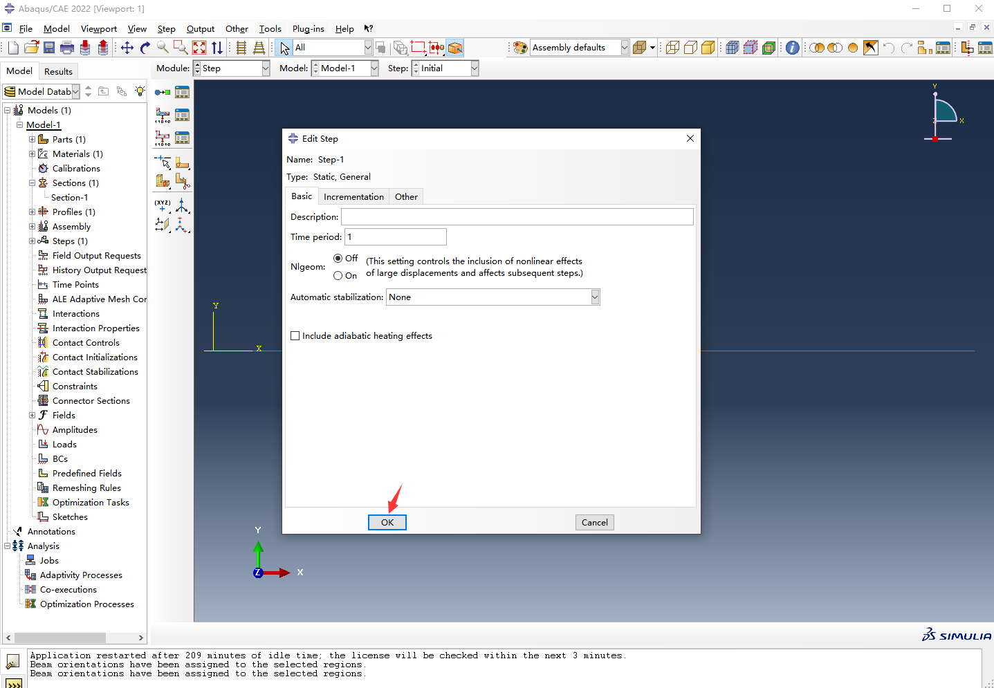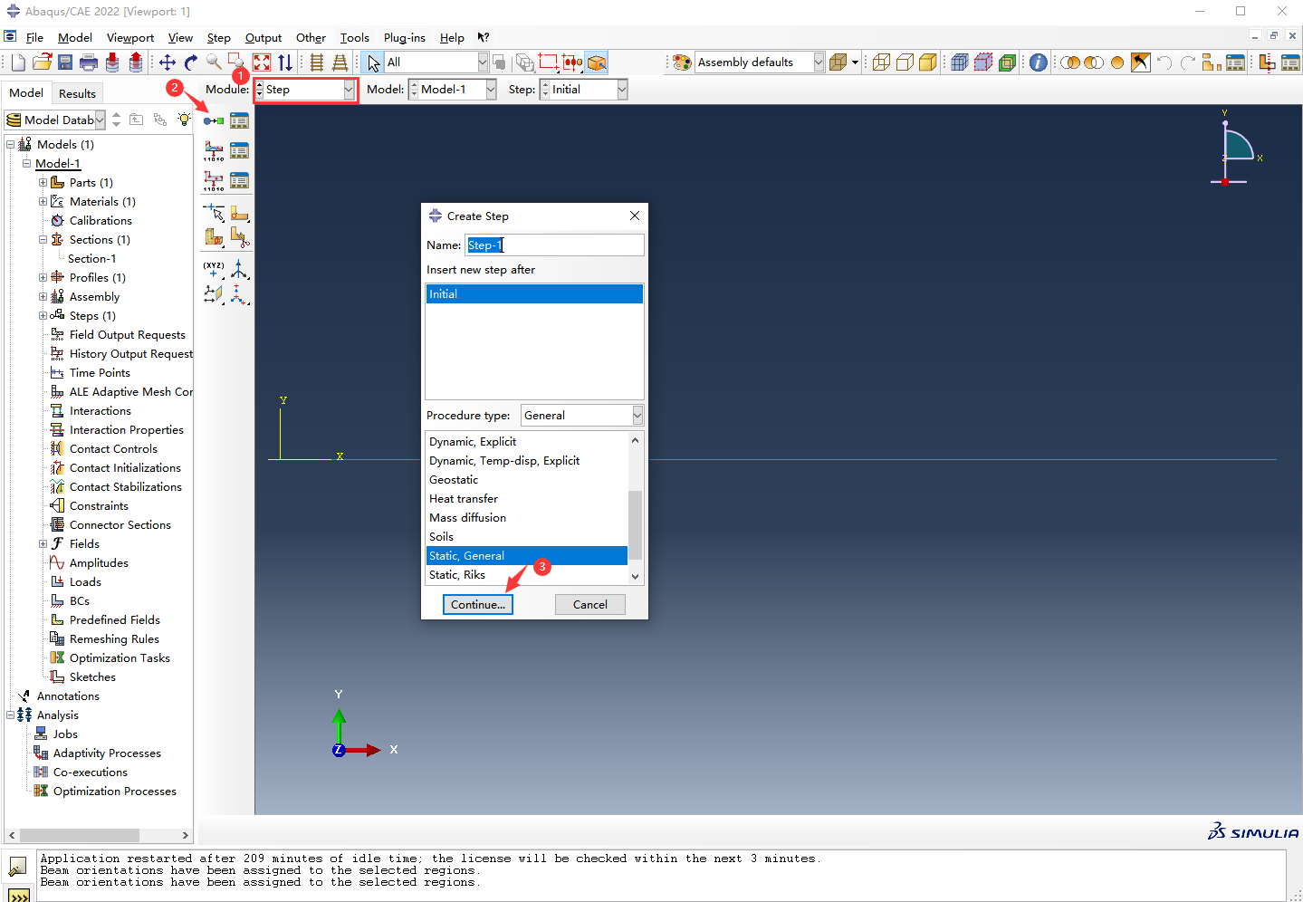 14.分析步:在Module选择Step,点击Create Step,我们只进行静态分析,直接默认选择 Static ,General,点击Continue…。点击OK。