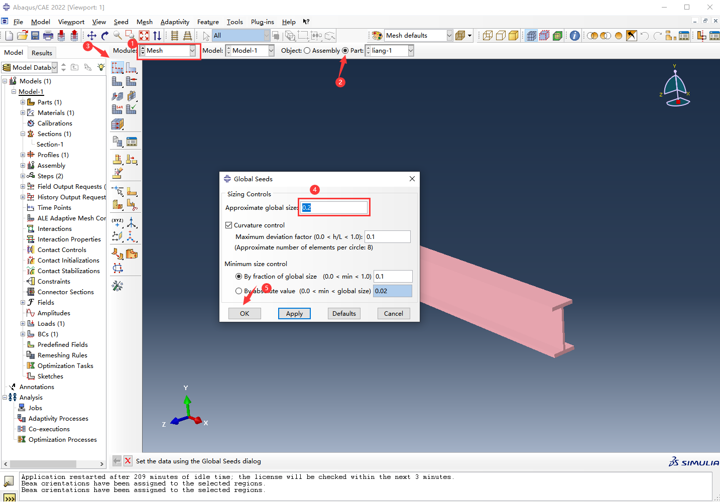 21.划分网格:在Module选择Mesh,点击Part,点击Seed Part,将种子间距设置为0.2(梁的长度为2m),点击OK。