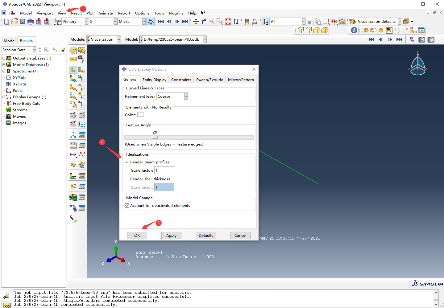 27.渲染梁的轮廓:点击View—>ODB Display Options,勾选Render beam profiles,点击OK。