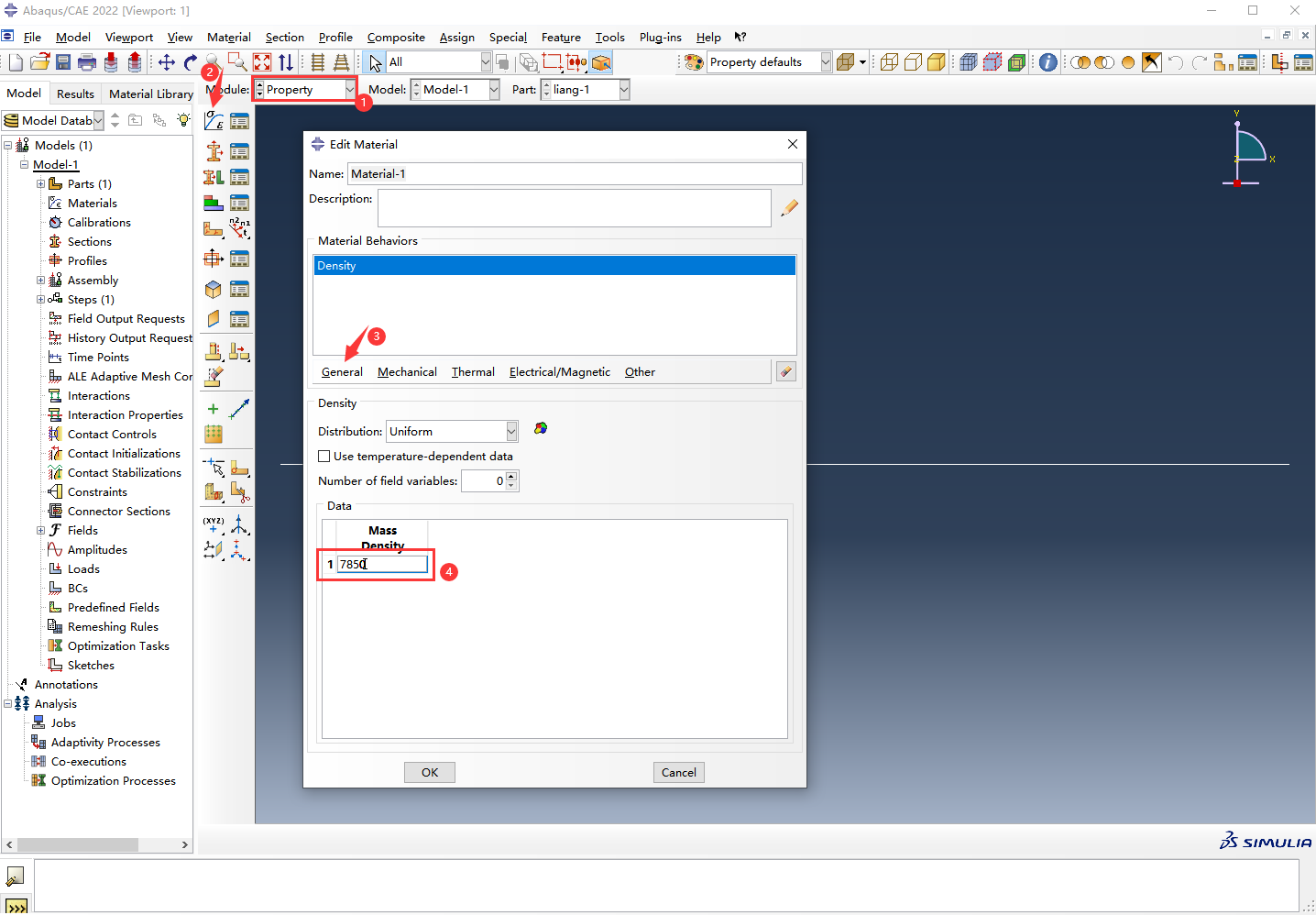 3.将Module,下拉为Property,编辑材质,点击General,选择Density,填入7850。