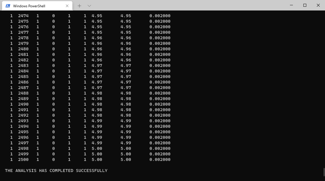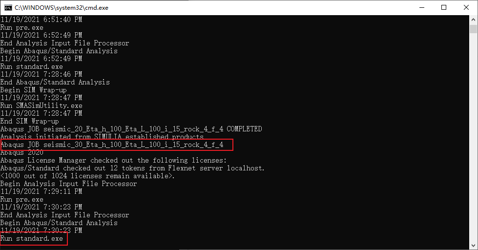 这里的 job-name 是与要计算的 inp 文件同名的文件名(但不包含.inp后缀),这将默认创建一个名为 job-name 的任务并提交计算。cpus=n 是指定计算时使用的 cpu 的核心数。int 是指 interactive ,即abaqus在计算时会在命令行窗口打印一些信息供用户了解abaqus现在在干嘛。如下所示: