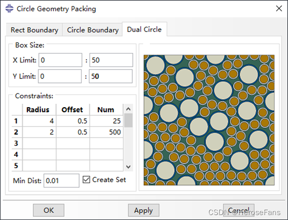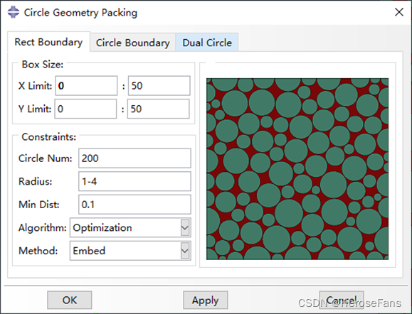 用于在圆形边界内填充圆形骨料,支持指定圆形骨料尺寸范围。