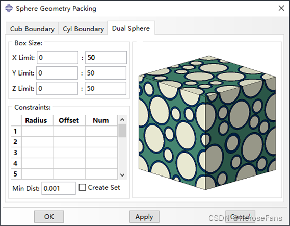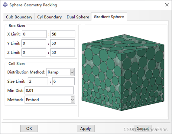 用于在长方体边界内梯度填充球体骨料,可控制球体骨料间的最小间距。