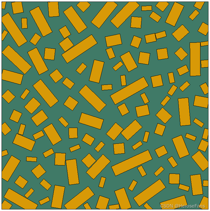 在50x50的矩形边界上填充宽度为2.5,长度在1~10变化的矩形骨料,按最大数量填充,填充结果如下图所示,填充率可达40%左右。