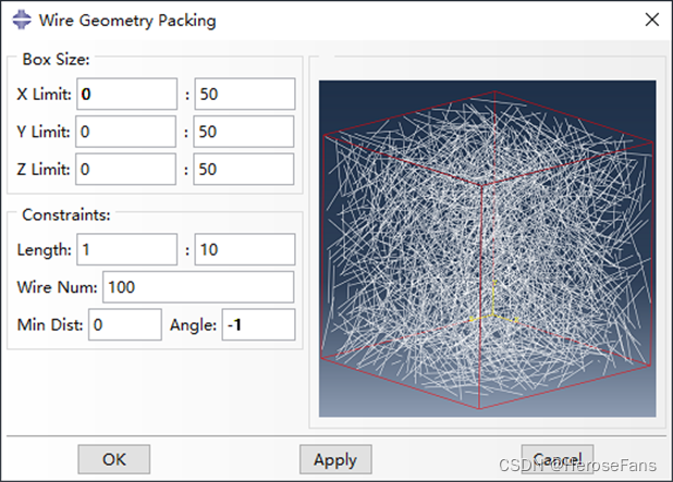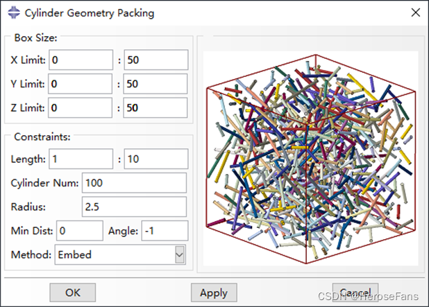 用于在长方体边界内随机填充纤维,可 控制 纤维长度在某一范围内变化,同时可控制纤维间的最小间距。