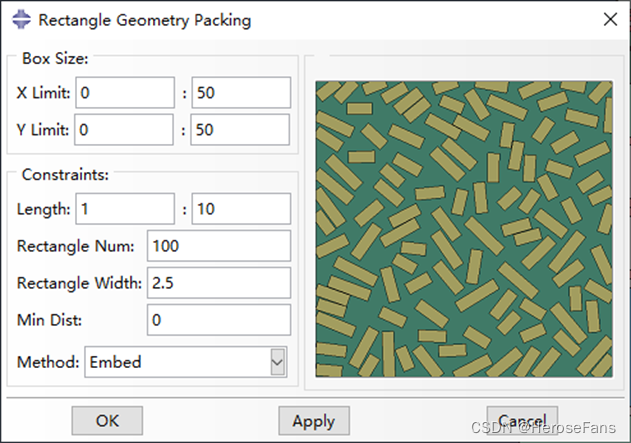 用于在矩形 边界 内填充矩形骨料,矩形骨料长度可按范围指定,同时可控制矩形骨料间的最 小间距(如果为负数,则表示矩形可相交)。