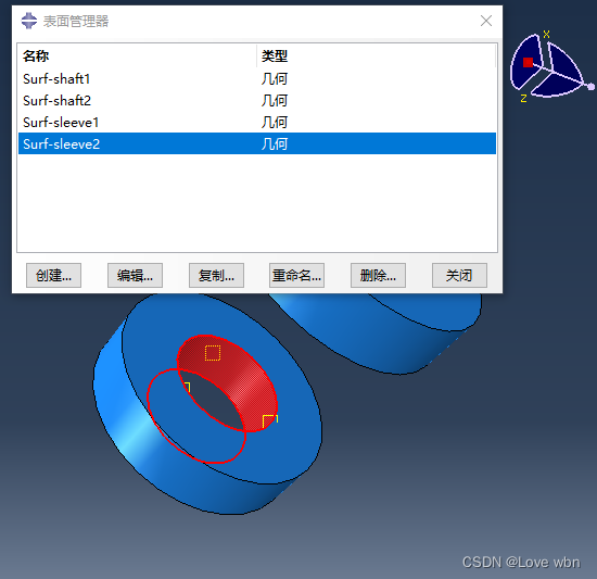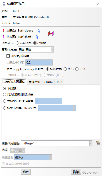 3)定义接触:分析步选择初始分析步;设置主面为“Surf-sleeve”,从面为“Surf-shaft”;