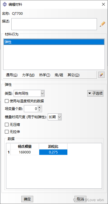 2)为销轴套定义QT700的材料:E=1.69e5,泊松比0.275;