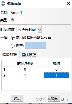 进入幅值创建管理器,为过盈接触定义幅值曲线:这是因为Abaqus默认的幅值是1到0,在这里自定义一个0到1的幅值变化过程;