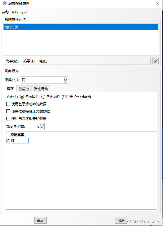 2)创建相互作用属性:切向行为-罚-摩擦系数0.15(如果没有摩擦约束,计算不会收敛,摩擦的存在为接触提供了软约束,限制了刚体位移的出现),不用定义法向行为, 系统 会默认为“硬“接触。