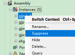在选择一个模型表面的时候,其他模型很可能会影响选取,可以在左侧的 “Assembly” 中 “Instances” 中选择不想选取的模型,右键,选择 “suppress”,这个模型就会暂时隐藏掉,不会被选取,如果想让他恢复,右键点击 resume 即可。