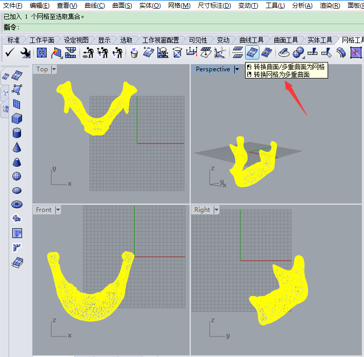 导入之后,左键单击模型(任意视图中),模型会变为亮黄色,“网格工具”中的转换按钮,即可将模型转换为多重网格,如下图所示。