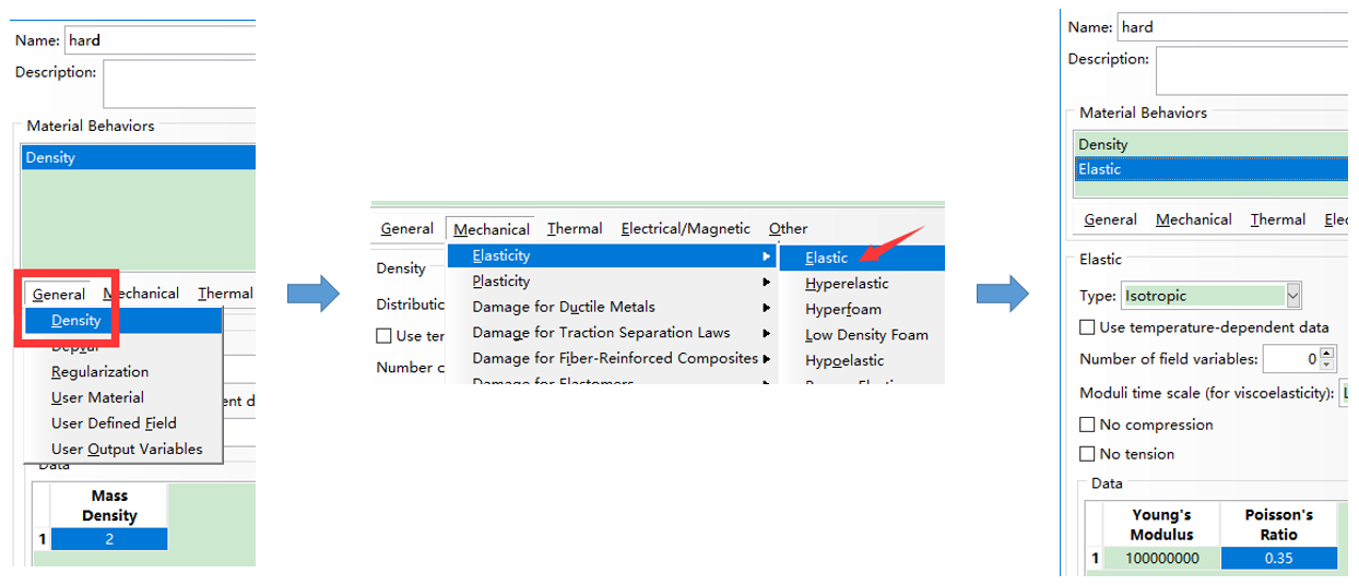 修改材质的名称,General 中选择 Density,设为 2,然后在 Mechanical 中选择 Elasticity 中的 Elastic,设置 Young’s Modulus(杨氏模量)为 100000000,Poisson’s Ratio(泊松比)为 0.35,如下图所示。