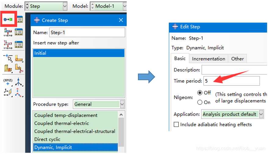 这一步是设置有限元分析的总时长和每一步时长。点击 “Create Step” 按钮,选择 Dynamic,Implicit,点击 continue,根据自己需要修改 Time Period,我这里使用的是 5。