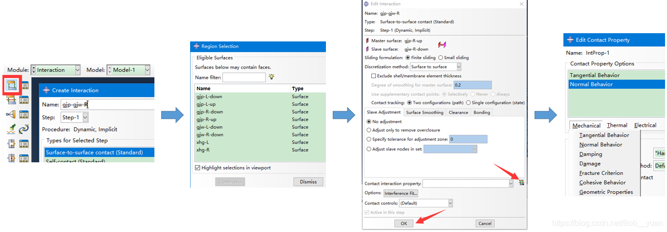 将所有需要用到的会接触的表面选取完成()后,就可以开始设置接触(Interaction)了。