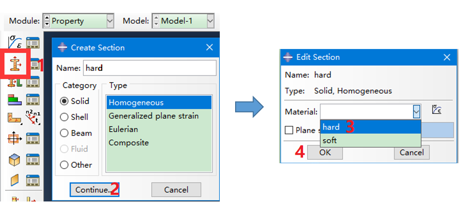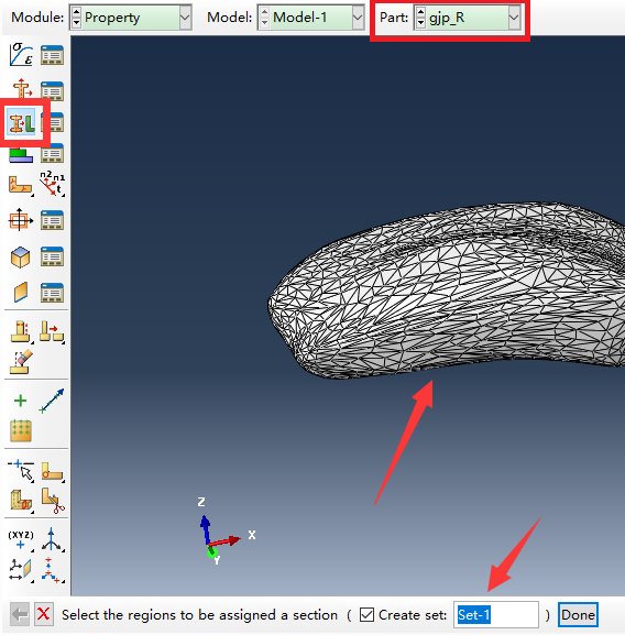 点击 Property 中的 “Assign Section” 按钮,左键单击模型,即为模型赋予材质,右下角可以修改这个区域的名称,上方 Part 内可以切换模型,为不同模型赋予材质,如下图所示。
