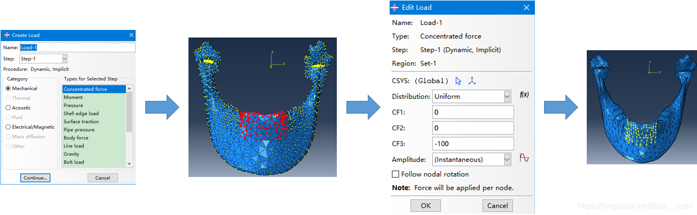这一步设置和。首先先设置力,点击 “Create Load” 按钮,给这个力起个名字,点击 continue,鼠标框选受力点,设置xyz三个方向的受力,最终结果会用箭头表示三个方向上是否受力。