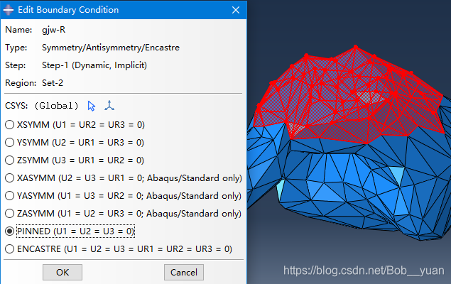 为了演示,只设置了一个很随便的力,位置也是随便选的,接下来就是设置 边界 条件了,点击 “load” 中的 “Create Boundary Condition” 按钮,鼠标框选出在模拟过程中保证不动的点(如果有其他模型碍事,就 suppress 掉),选择 Pinned 或者最后一个都行。
