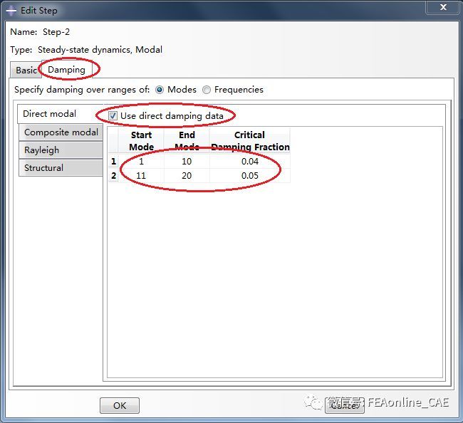 界面操作:在分析步骤内定义直接模态阻尼,如下图所示,激活直接模态阻尼选项(DirectModal),并在数据行内输入数据。