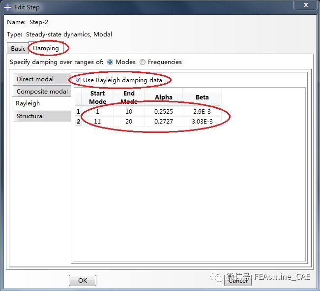 使用瑞利阻尼有许多方便,例如系统的特征频率与对应的无阻尼系统特征值一致;相对于其它形式的阻尼,可以精确的定义系统每阶模态的瑞利阻尼;各阶模态的瑞利阻尼可 转换 为直接模态阻尼,在ABAQUS/Standard中将瑞利阻尼转换为直接模态阻尼进行动力学计算。ABAQUS在模态动力学分析步骤内定义瑞利阻尼,如下图所示,激活瑞利阻尼选项(Reyleigh),并输入数据。