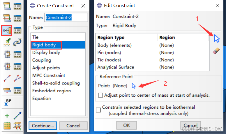 单击Creat Constraint,选择约束 类 型为刚体(Rigid body),点击 Continue;在 Edit Constraint 的页面中,点击蓝色的鼠标按钮,选择钢球;然后在 Reference Point 中点击蓝色的鼠标,选择第一步创建的参考点,点击OK,将球定义为刚体。