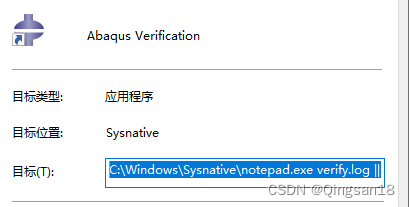查看了一下verification这个程序的属性,发现它的目标直接指向了记事本,这个应该是abaqus安装程序的一个bug