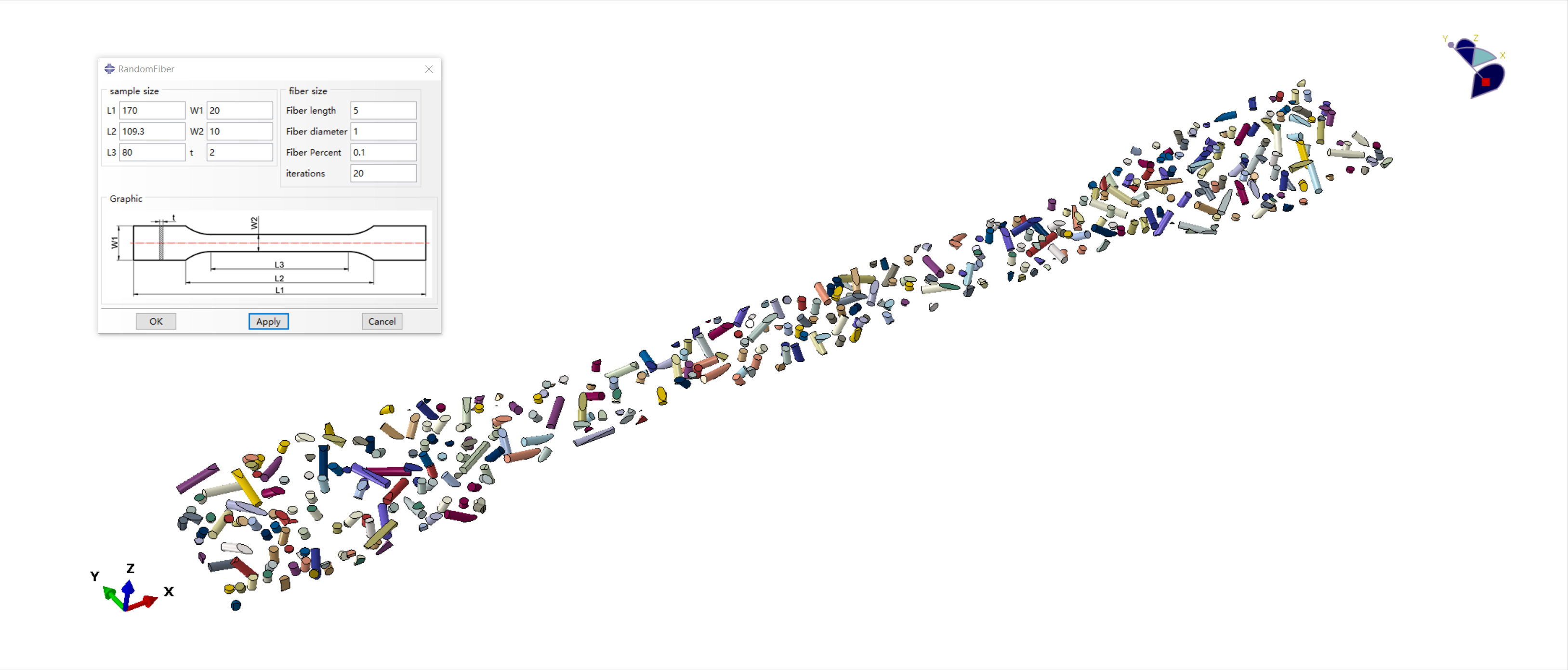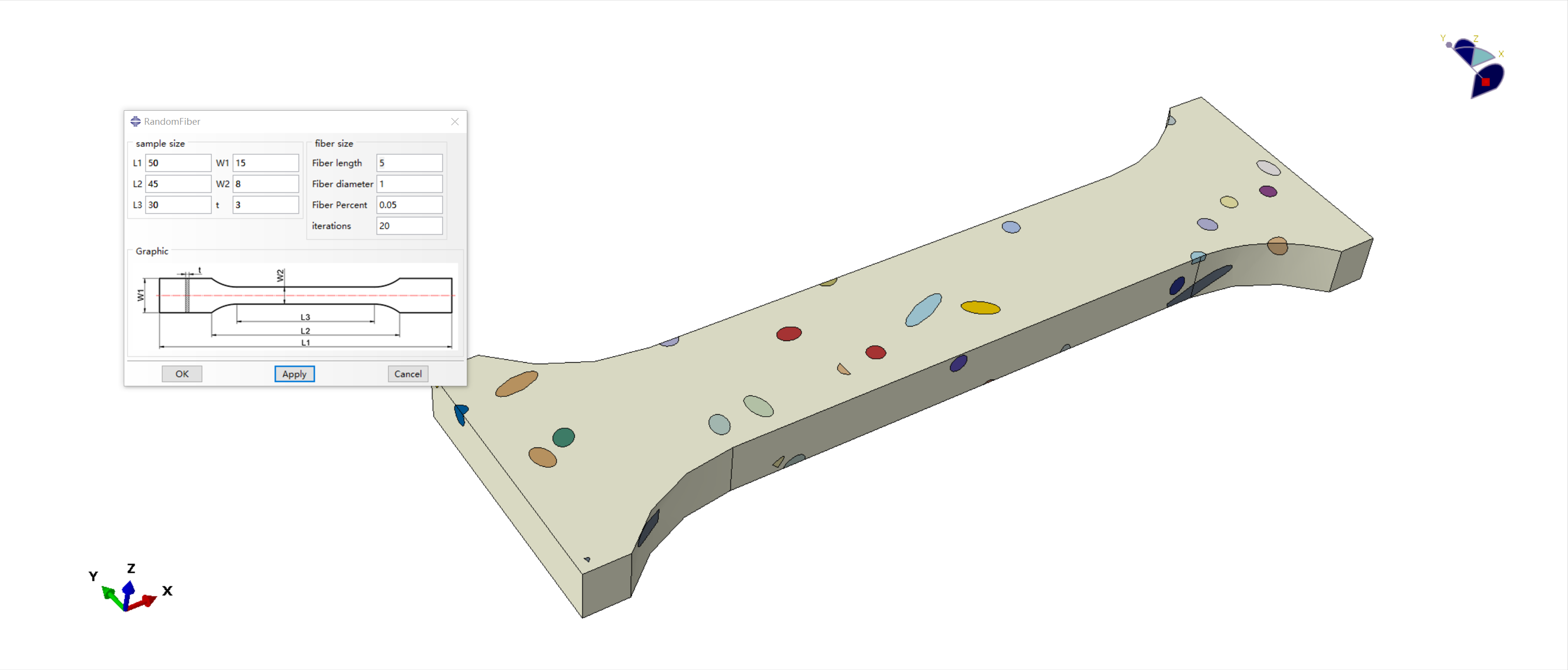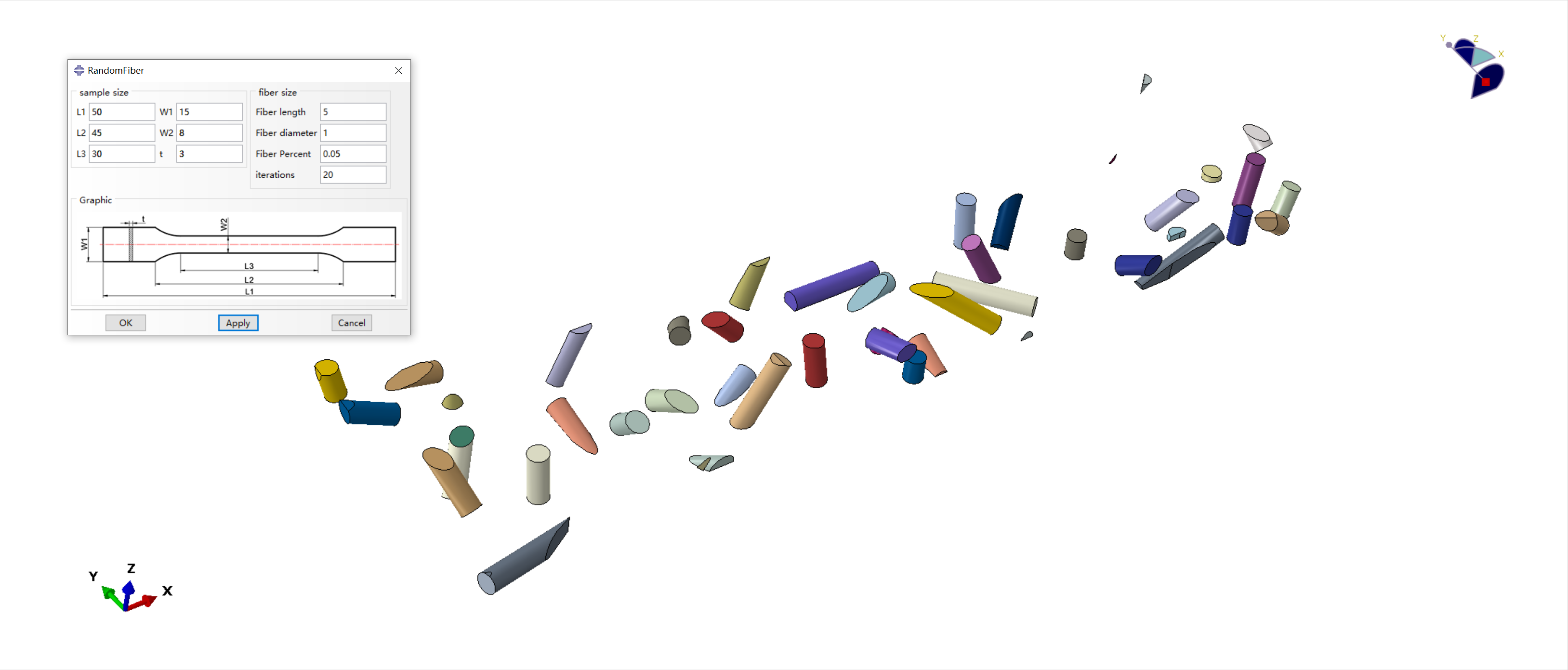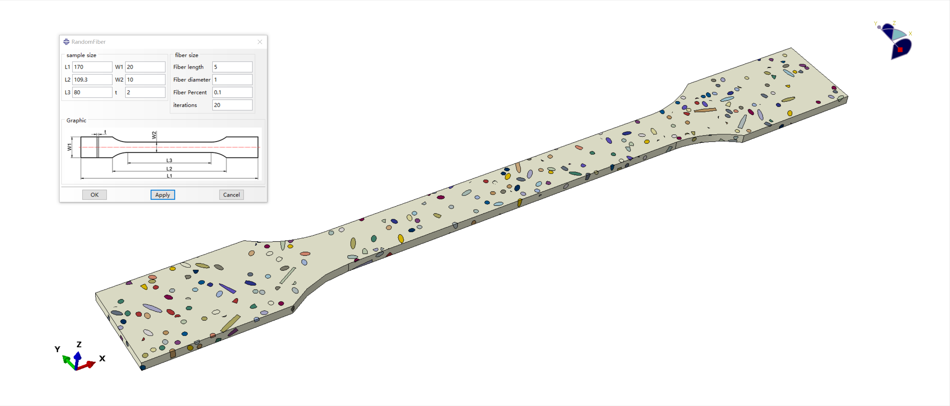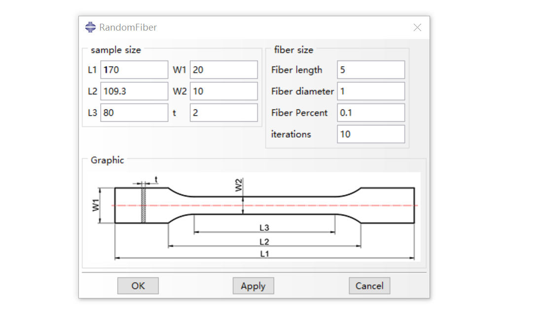 本插件的参数主要分为两大部分,拉伸试样的尺寸,以及纤维的尺寸。拉伸试样的尺寸中主要定义了长度方向上的三个尺寸,宽度方向上的两个尺寸及厚度方向上一个尺寸;纤维尺寸中,定义了纤维长度、纤维直径纤维的体积分数,以及用于控制脚本收敛的迭代次数。