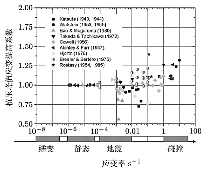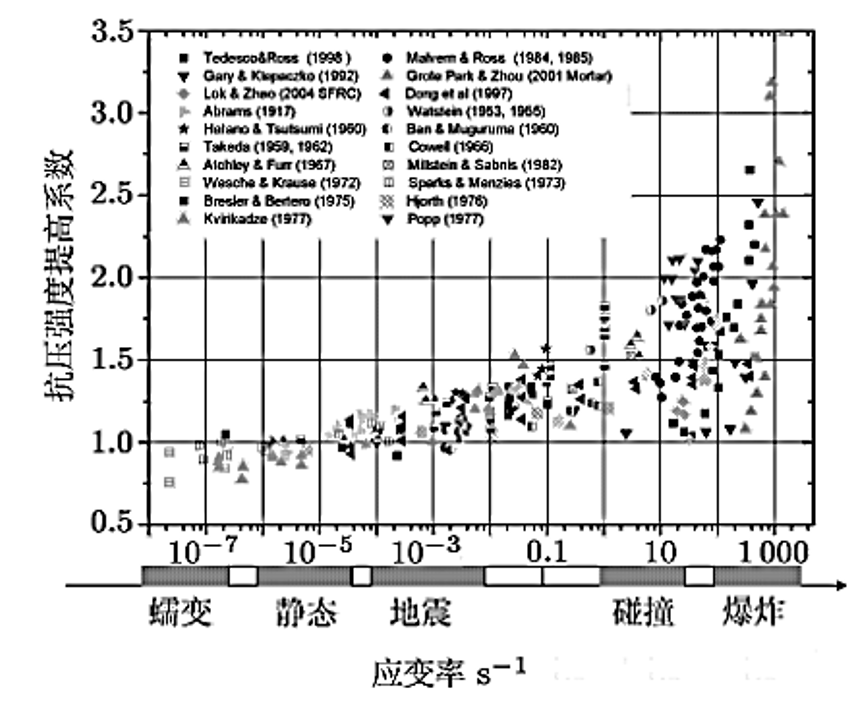 我们会经常基于混凝土损伤模型,应用准静态本构(或者动力本构)对构件进行拟静力往复模拟(如柱子),单调加载模拟(如梁),甚至是碰撞或者冲击模拟。和一切物理科学研究的基本发展过程相类似,为探究宏观常见的灾害(如地震)对混凝土构件动力本构的影响问题将从实验开始展开的。载荷速率对混凝土抗压强度影响的研究成果,在大多数情况下,混凝土动力强度的增长都可以用载荷速率(或应力速率、应变速率)比的对数关系来加以表示。