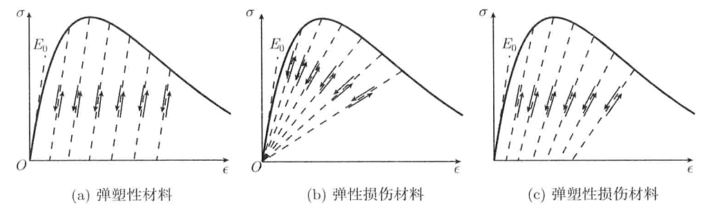 而事实上混凝土卸载时不但表现出刚度退化现象,还存在不可恢复变形,因此采用如下图所示的弹塑性损伤模型更能描述混凝土损伤全过程。