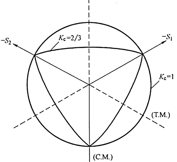 K(建议取值K=2/3)表征的是在最大主应力为负值,对于任意给定压力不变量p值的初始屈服处,拉伸子午线上的第二应力不变量q(tm)与压缩子午线上的q(cm)的比值,而且它必须满足0.5<K<1.0,如下图偏平面中的屈服面。