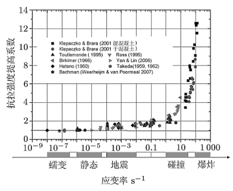 从下图可以知道,地震在应用准静态本构,进行地震动力模拟,或利用拟静力滞回试验的结果应用到地震工程分析具有一定的可靠性。而碰撞与冲击为了仿真符合实际,应考虑碰撞与冲击混凝土本构。